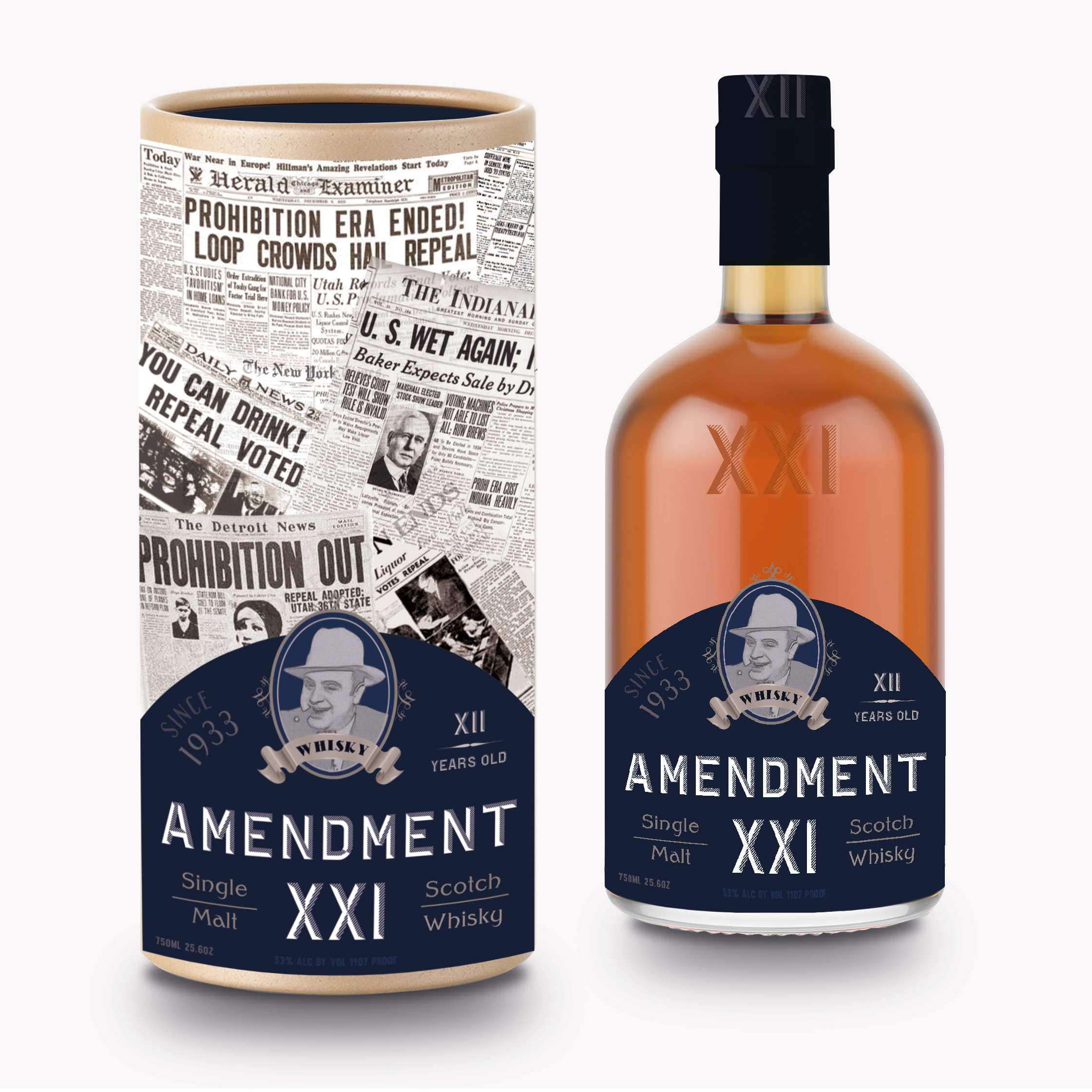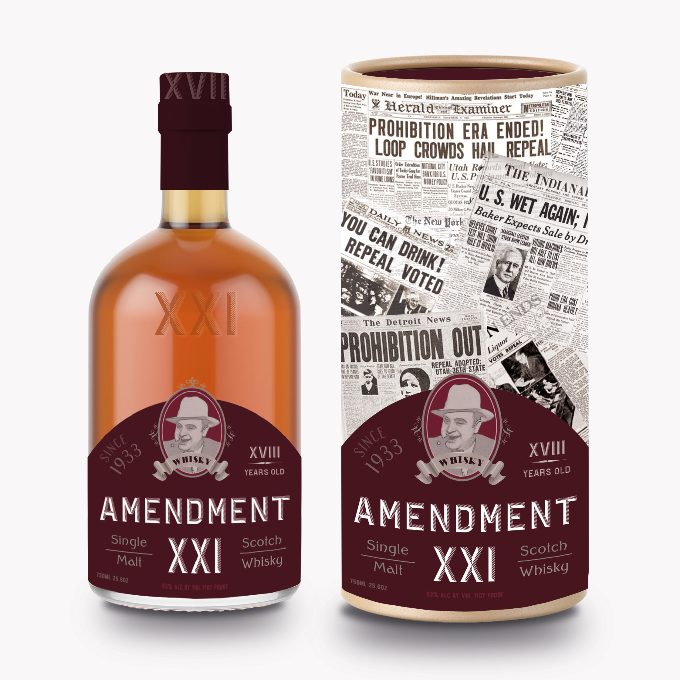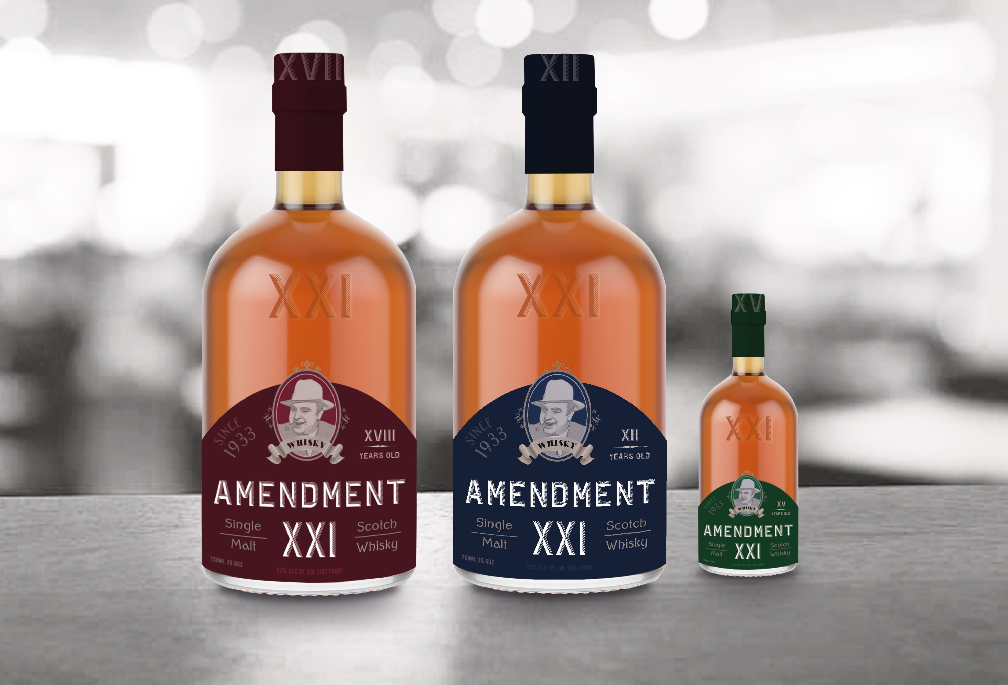 Amendment 21 has constructed on alcohol prohibition concept. Colors have appointed the bottles and packages with respect to scotch’s age. Despite the conceptual classical look; logo design brings in a little bit of irony with Al Capone’s illustration to the appeal of liquors.