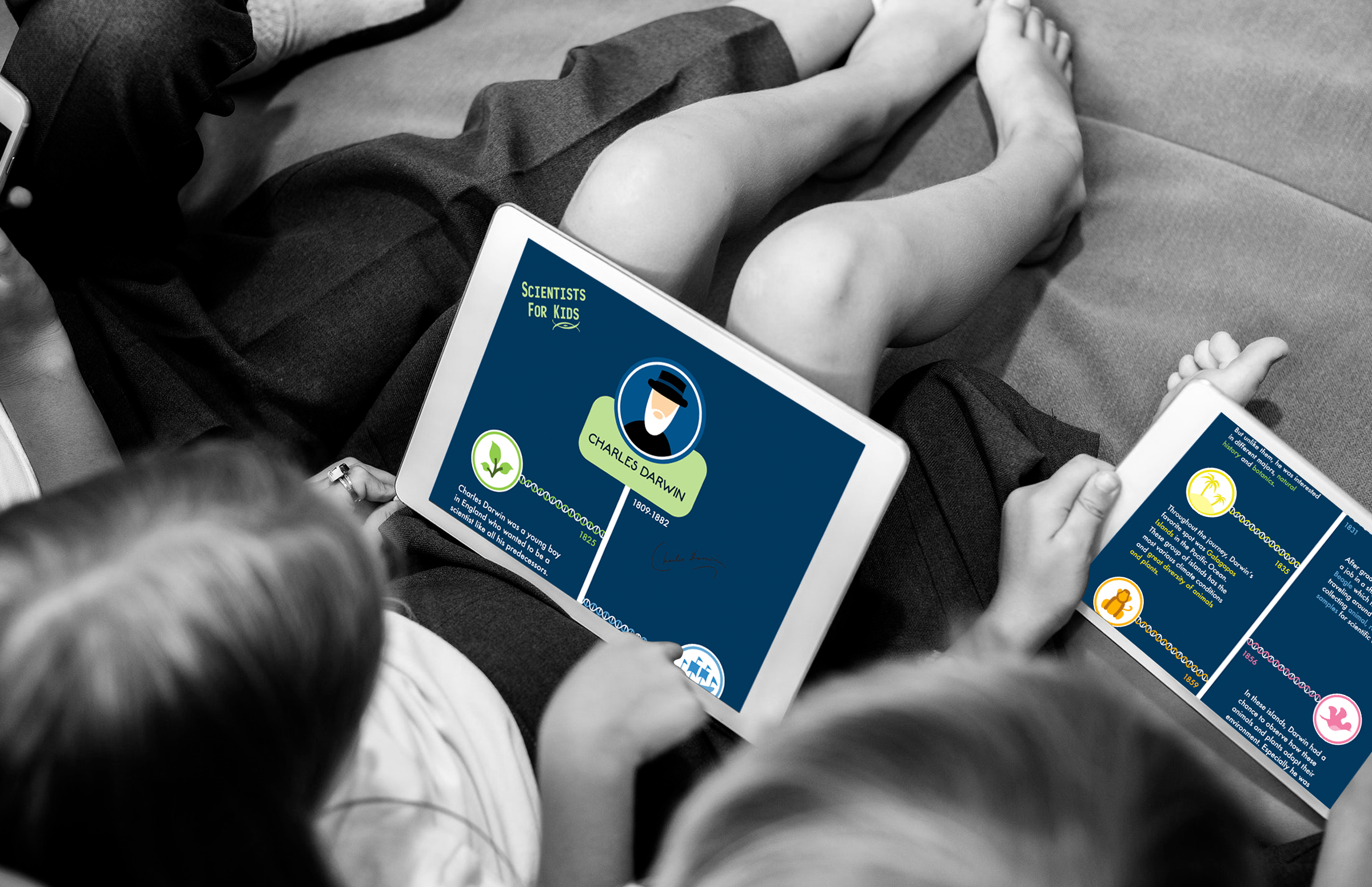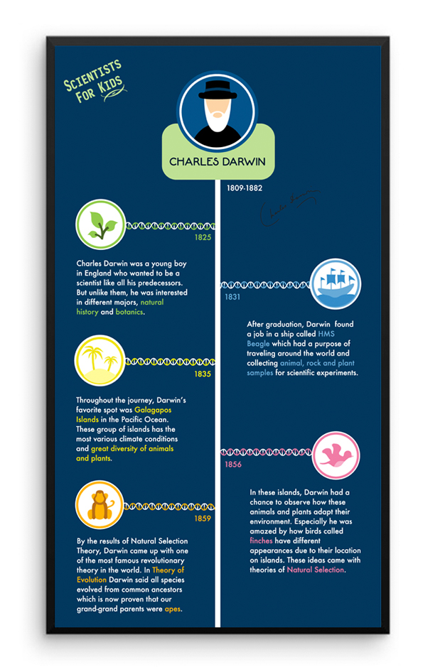 Scientists for Kids infographic is designed to teach children about famous scientists and their ideas from throughout human history. Because of the target, illustrations are made for them to understand the concepts easily. Copywriting supported with playful images and icons. This design can be applied to print and also digitally.