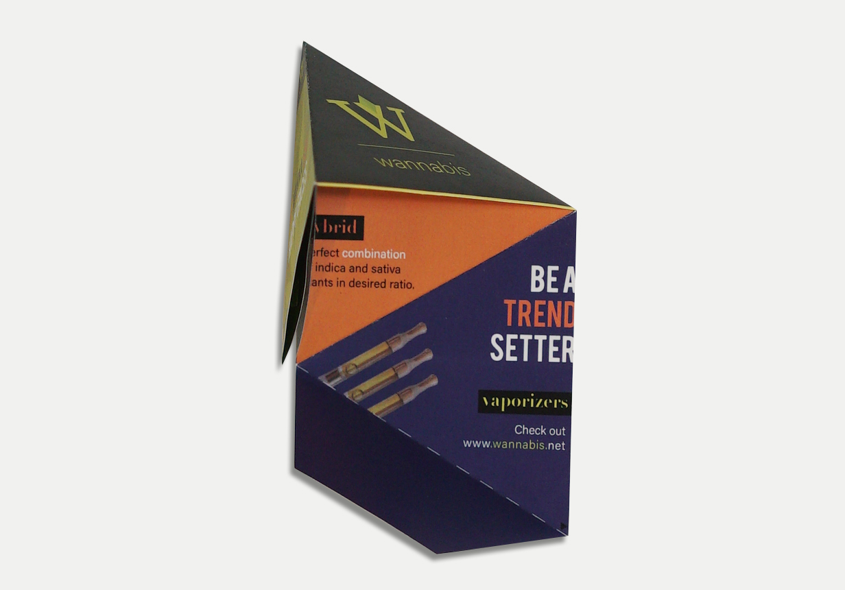 This work has been created for a medical cannabis dispensary to be presented on the store and also to be used as a mailing. It has a pyramid form and triangle pages lead viewers to the menu page inside.